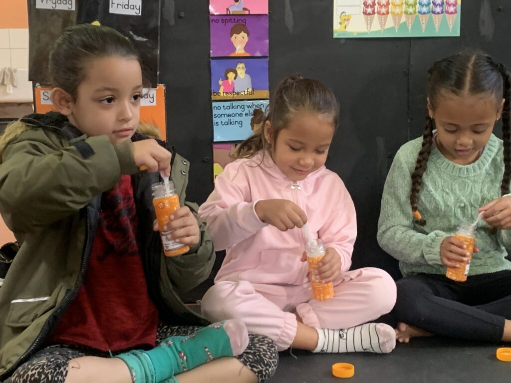 Dan mogen ze eerst ‘voorgekookte’ bellen blazen uit een potje. Dat doen ze fanatiek. Als er een potje niet werkt, ruilen ze. Mooi is een meisje dat ontdekt dat ze ook bellen krijgt met een reuze bellenblaas als ze daarmee op en neer gaat. Dus bellen blazen hoeft niet alleen met blazen. De bellen vallen op de mat, op mijn benen, op truien en broeken. Veel plezier. Haley bespreekt even kort na. Opeens gaat een jongetje met zijn hand even over de mat en hij merkt dat er een soort sop komt. Iedereen valt in, lekker de mat soppen met hun handen. Haley lacht, nieuwe ontdekking!