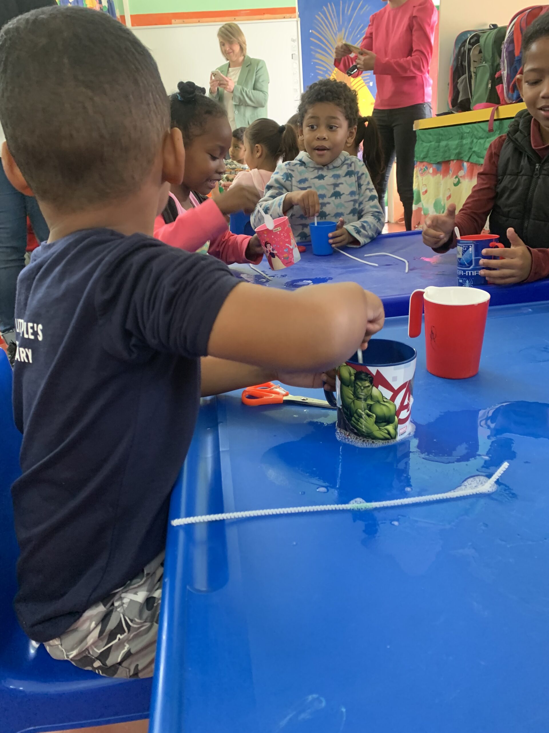 Dan gaan de kinderen naar hun tafel met de vraag: hoe kun je zelf bellen blazen? Iedereen een bekertje, klein laagje water erin, plastic lepeltje. Dan mogen ze kiezen tussen afwasmiddel en douchegel. Dat laatste is echt iets vreemds voor de kinderen, ik denk dat ze zoiets nooit gebruiken. Op tafel liggen scharen en een pijpenrager. Haley zegt dat ze kunnen roeren. Dan gaan ze aan de slag, ieder kind apart, maar er is één groepje van 6 en één groepje van 5 die bij elkaar zitten en elkaar van alles laten zien als ze iets uitgevonden hebben. Haley loopt rond en stelt de vraag: ‘Is there something you could use to blow bubbles?’ Een paar jongetjes zitten apart in een rijtje. Later mogen alle kinderen nog kiezen op ze nog een plastic vorkje willen of meer afwasmiddel of douchegel. Daar wordt enthousiast gebruik van gemaakt. Het lukt de meeste kinderen prima om bellen te blazen, zelfs uit het vorkje komen kleine bellen, en uit de ronde gaten van de schaar. De pijpenrager wordt gebogen en gebruikt. Mohamed, die volgens Haley ook bijna nooit iets zegt, heeft een zeepvlies in het oog van de schaar, hij probeert het stuk te maken met het lepeltje, lukt niet; het vorkje, ook niet; zijn vinger, ook niet. Hij wordt heel opgewonden en de hele tafel moet meekijken van Mohamed. Ze gaan het ook proberen. De drie jongetjes die apart zitten zijn wel aan het werk, maar missen inspiratie van anderen. Achteraf hebben we daar een hele interessante discussie over: moeten ze bij de anderen? Of juist niet, omdat ze zo verlegen en volgzaam zijn. Komen ze nog wel aan ontdekken toe als ze bij andere, snellere kinderen zitten? Haley gaat het bespreken met Leslynn en ze gaan er een plannetje voor maken.